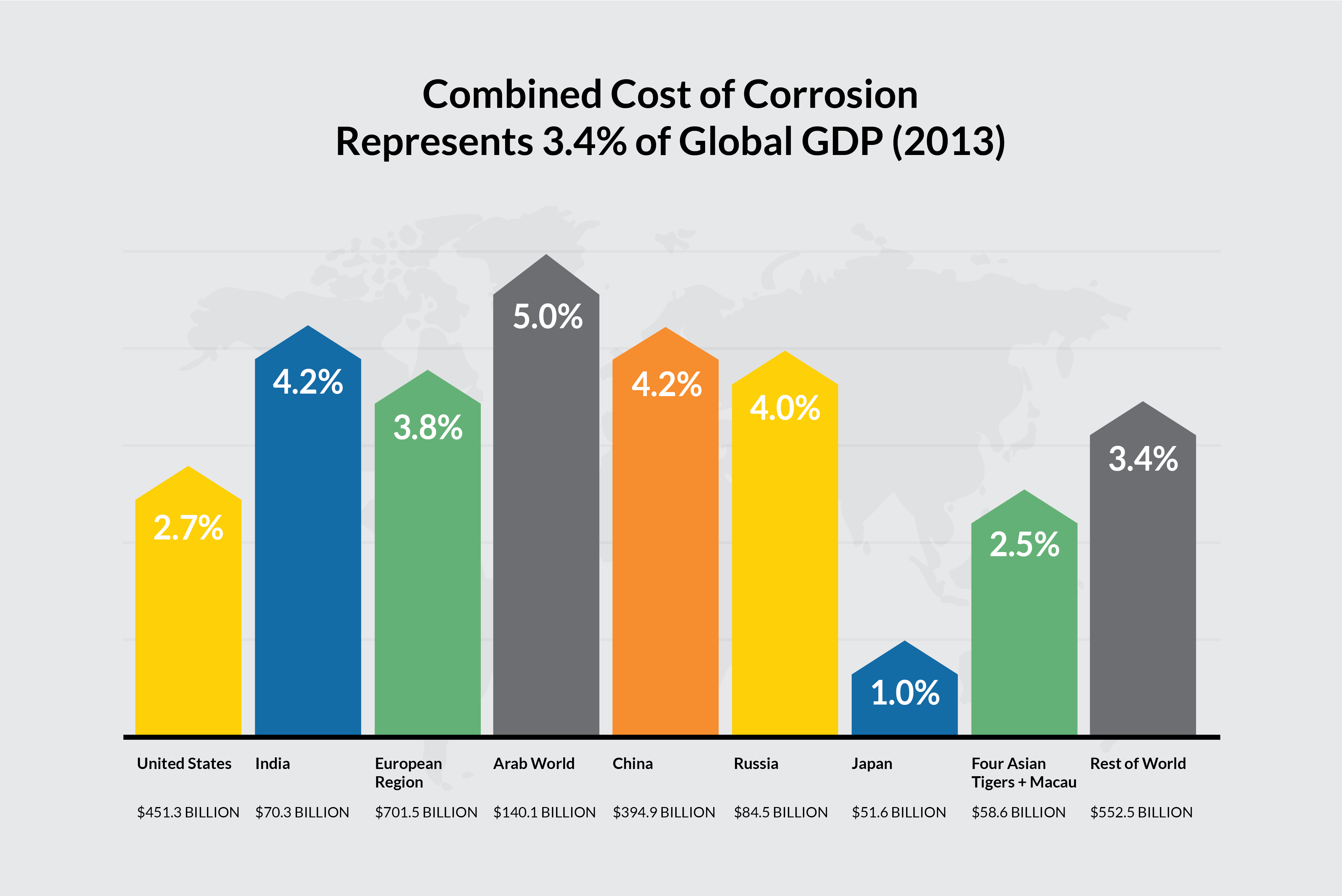 That $2.5 trillion sum is nearly 3.4% percent of the global gross domestic product (GDP) — needless to say, corrosion is a massive, costly problem.